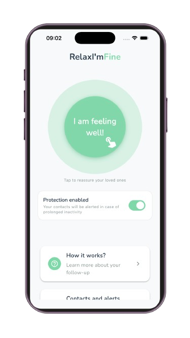 RelaxI’mFine is a simple app accessible to everyone. Each screen is designed to be intuitive and clear, so you can focus on what really matters: the safety and peace of mind of your loved ones.